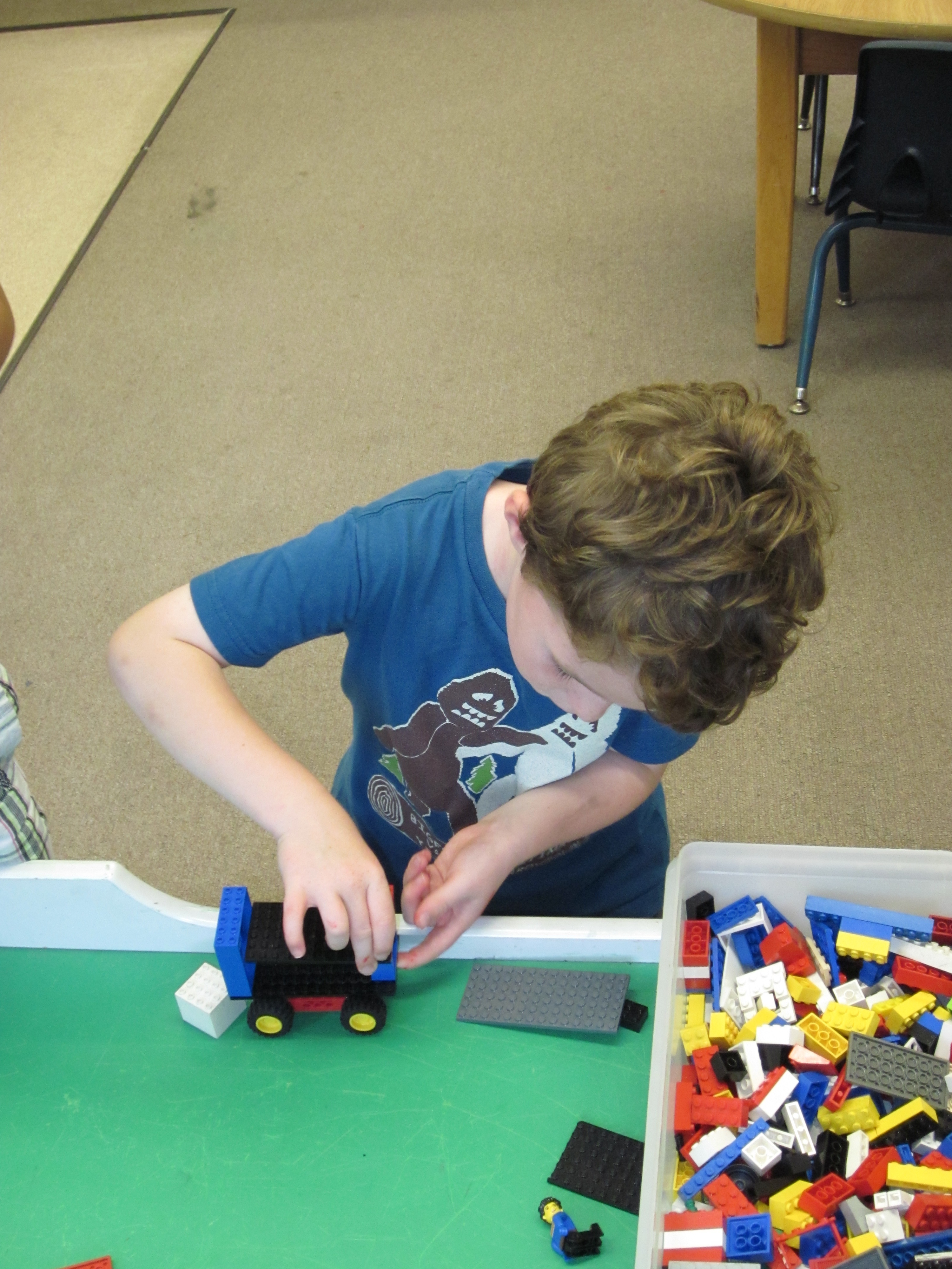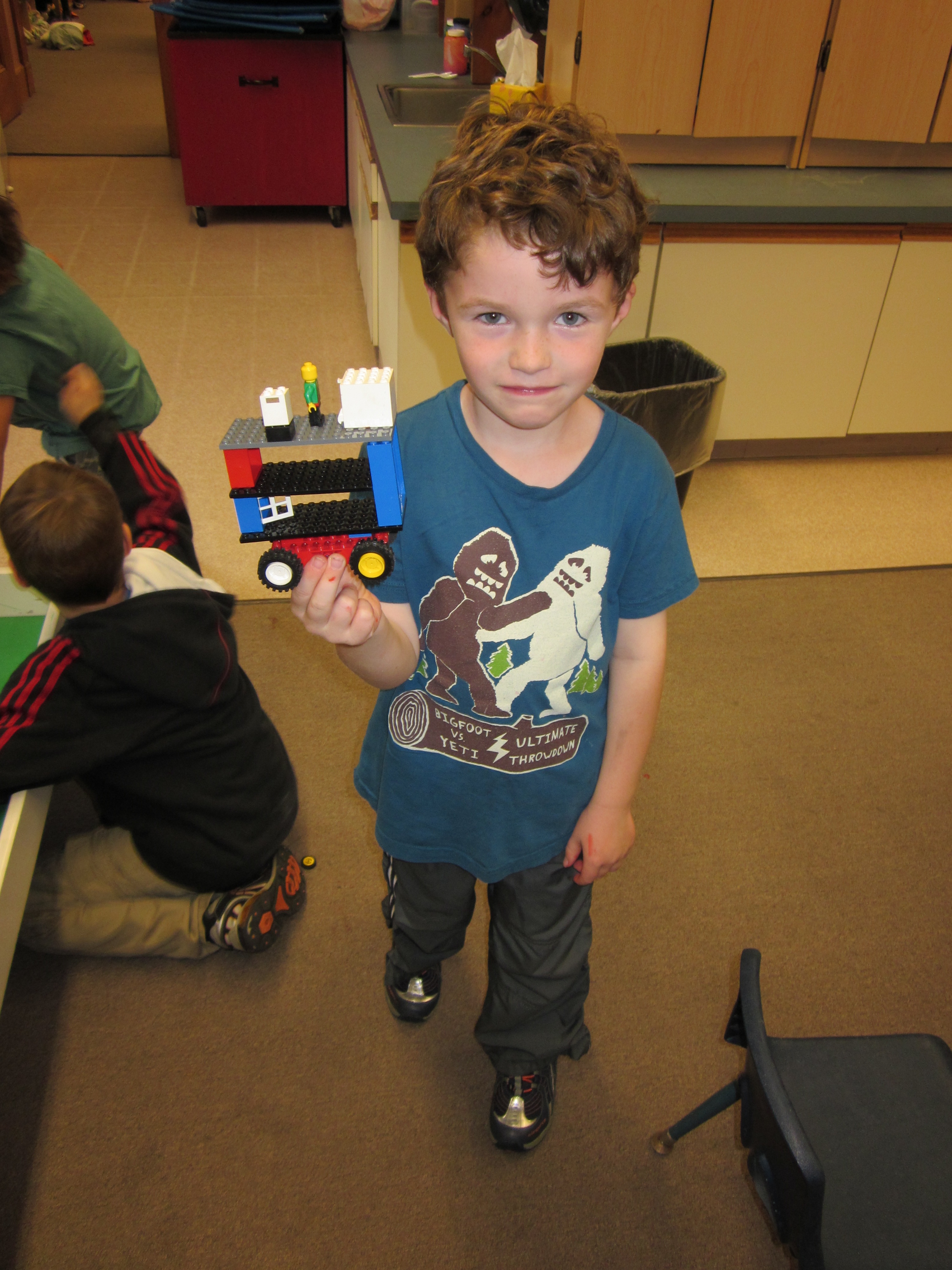 I noticed right away that Reid, one of the twins, was making some sophisticated Lego creations, in this case a vehicle. When I asked him about the vehicle, he clearly had a story narrative to go along with the truck. See the video below. This supports the idea that kid’s engineering is frequently closed tried to creative or fantasy play. An interesting question is what comes first: do they build to support the fantasy they have in mind, or do they build first and create a narrative around that, or is it simultaneous and co-evolving?